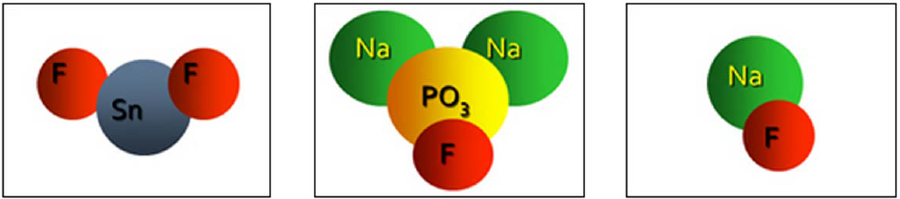 The desire to find a more effective dentifrice and the ideal active ingredient and abrasive system spurred continued research in the development of therapeutic dentifrices. After the success achieved with SnF2 (Figure 3a) dentifrices, sodium monofluorophosphate (SMFP, Na2FPO3 - Figure 3b) actives were eventually introduced and found to be compatible with a variety of abrasive systems, and the combination demonstrated positive caries benefits in most clinical studies. The search for a more stable formulation and greater caries effectiveness also led to the introduction of a sodium fluoride (NaF - Figure 3c) formulation, which eventually replaced the original stannous fluoride (SnF2) active ingredient. This new product used the advertising phrase of "Fluoristat" and combined NaF with a silica abrasive system that proved more effective against caries than the earlier "Fluoristan" formulation. This change in active agents occurred in 1981, after silica abrasive systems were developed that were compatible with most of the active agents found in dentifrices.34 All of the fluoride actives have been shown to be successful, to some extent, in preventing dental caries when used in a regular program of oral hygiene. The highly competitive toothpaste market has been a factor in the development of more effective products as well as improving flavor and increasing worldwide usage. This has been a great benefit to public dental health, as evidenced by the decline in the prevalence of dental caries over the past several decades in most developed countries.35