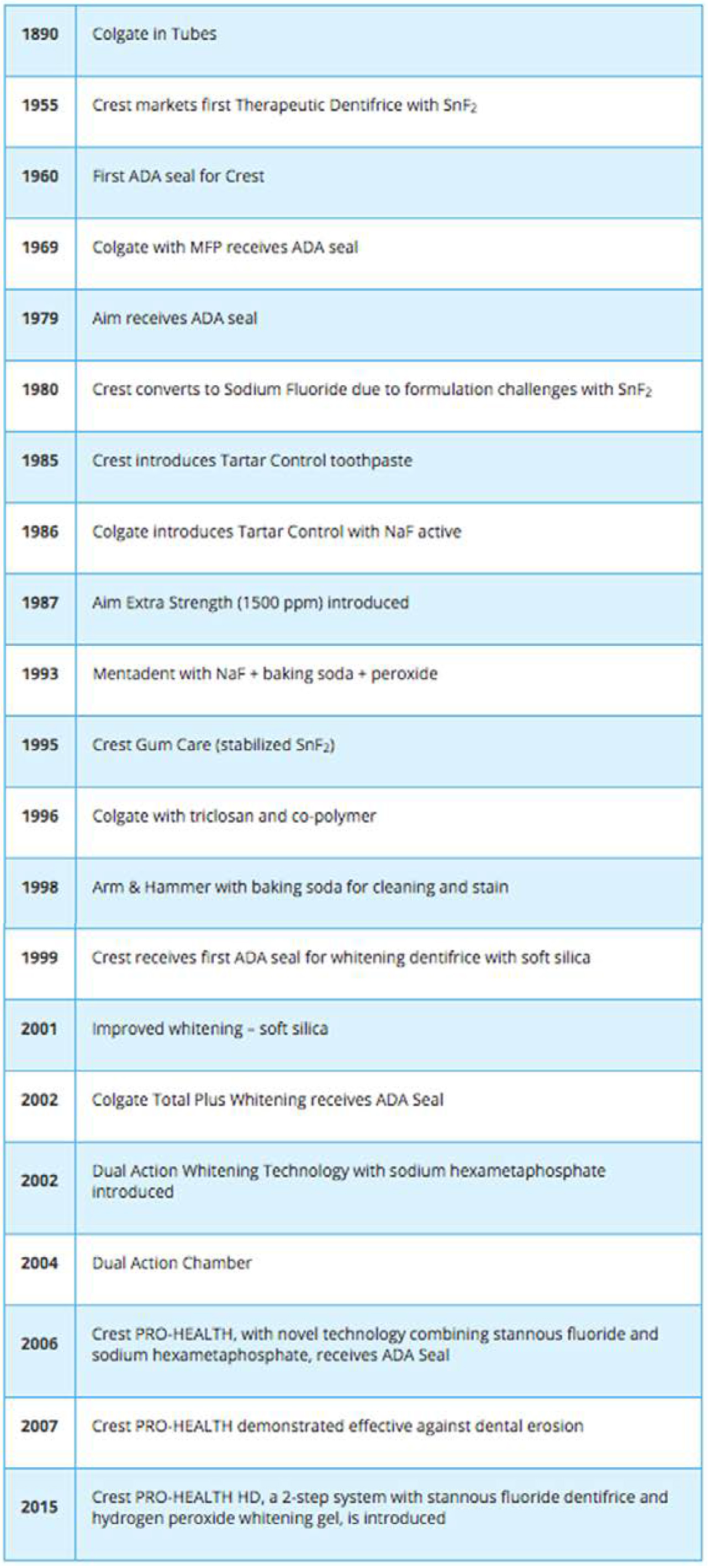The widespread acceptance of using toothpaste for improved oral health has resulted in the use of dentifrices as an effective delivery system for both cosmetic and therapeutic agents. This is evident by the myriad of dentifrice brands and types available at the local supermarket. One of the caveats to using proven caries preventive dentifrices to deliver additional oral health benefits is that we retain the original benefits of that product. This has meant significant testing is needed when formulating multi-benefit products to ensure that each ingredient is able to perform in the presence of the others. This is the same situation that faced NaF actives and calcium abrasives in the early dentifrices - compatibility of ingredients. In the development and marketing of new products, each manufacturer has had to test their new formulations in order to ensure the new additive or ingredient did not interfere with the existing "active" while also providing a significant new benefit. Table 1 provides a timeline of significant events in the development of cosmetic and therapeutic dentifrices. One of the more interesting developments was the addition of sodium bicarbonate dentifrices into the market. This product was introduced by Church & Dwight and included baking soda as the abrasive, which was traditionally used by previous generations as a popular tooth cleaner. The popularity of these products resulted in the production of baking soda products by all the other manufacturers as well. The dental care products from Church & Dwight had the greatest amount of baking soda (65%) compared to the Colgate and Crest products which were around 25%. Although it was commonly believed the baking soda abrasive was more aggressive, it ultimately proved to be milder than the more commonly used abrasive formulations.61