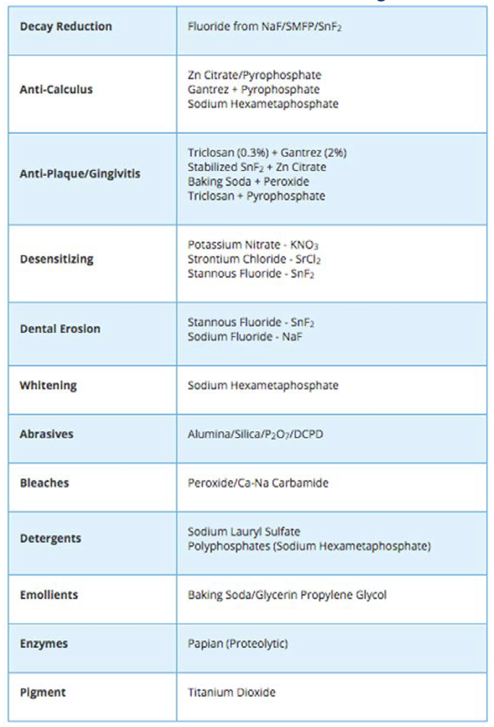 As oral care products continue to evolve, we can expect to see even more interesting combinations and approaches in the future, with each iteration intended to deliver either enhanced performance or an increased number of overall oral care benefits. While some of these future products may come from unique combinations of ingredients currently in use, others may include ingredients that are completely new to oral care products. Table 2 lists various benefits and functions of ingredients that are commonly used in modern dentifrice formulations.